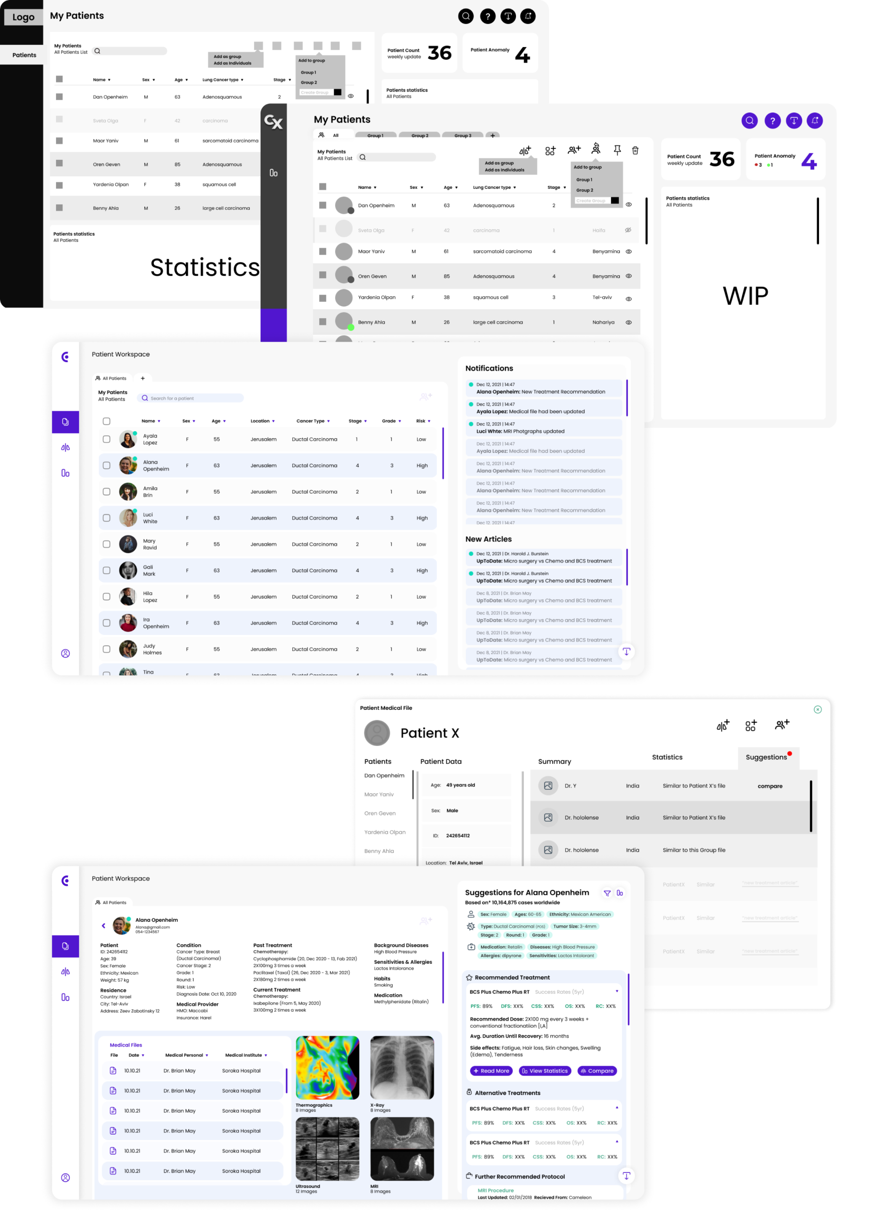 The main flow, patient workspace, allows a doctor to organize his patients as he likes, he can add them to more specific groups, recieve relevant notifications related to this patients, open each of their files, where he can see recent medical files that were updated and treatment recommendation which are based on our systems statistics of other similar cases worldwide.